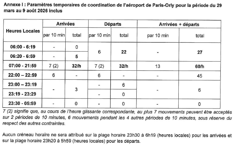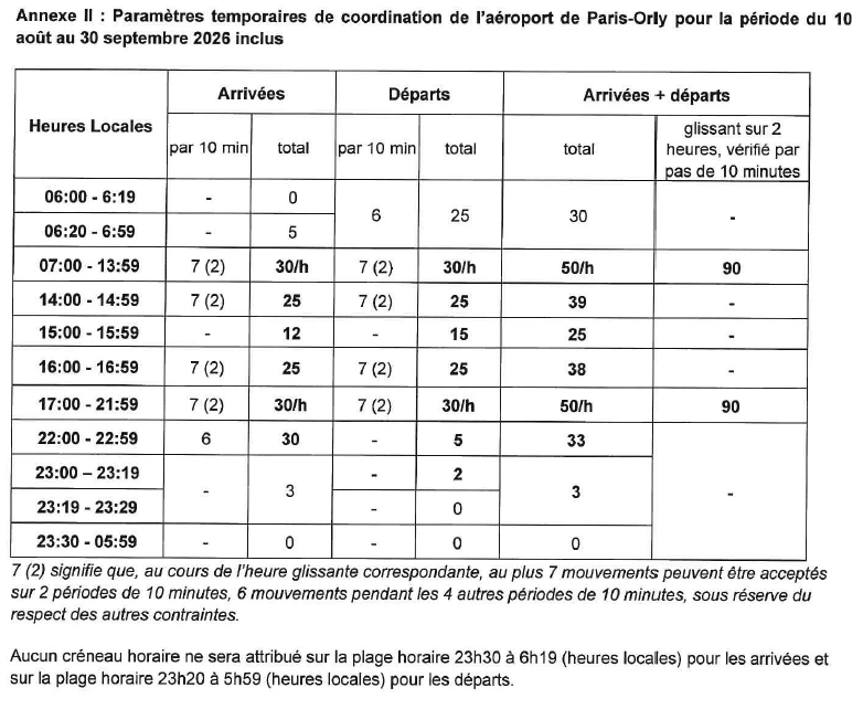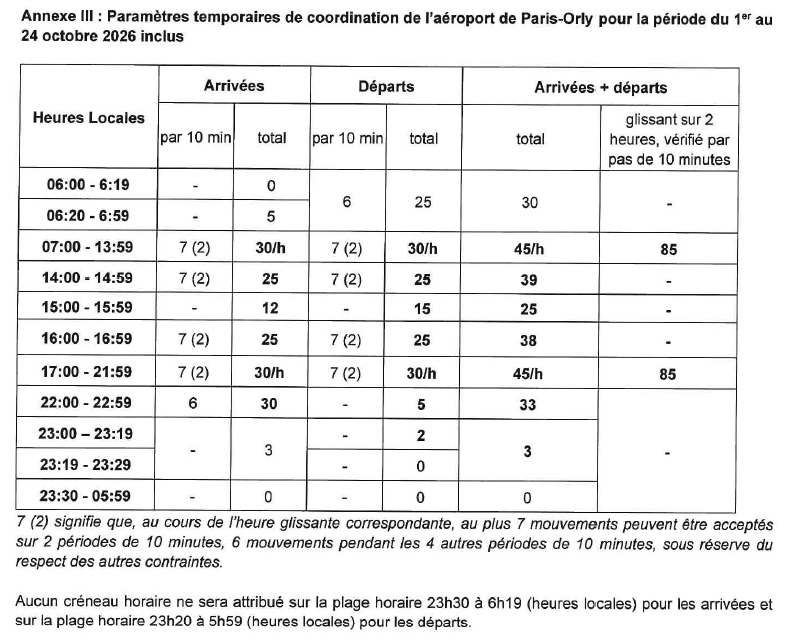 L’arrêté du 29 septembre 2022 modifiant l’arrêté du 19 octobre 1999 modifié, fixe la capacité piste de l’aéroport de Paris-Orly :