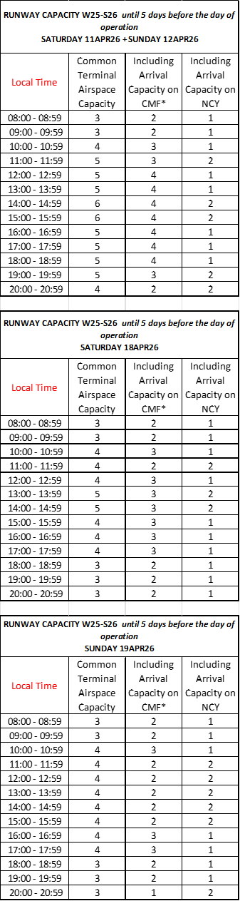 Reagarding the global capacity of the common airspace (TMA) to the 2 airports, Chambéry and Annecy, only arrival schedules are recommended to aircraft operators.